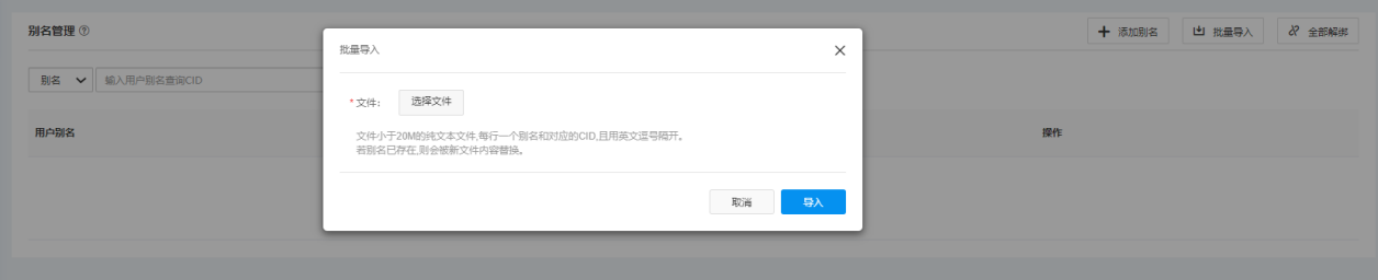 ②批量添加别名:首先创建一个别名和对应CID的TXT文本,然后点击【批量导入】上传别名列表文本,最后点击【导入】即可批量添加别名以及对应的CID用户。