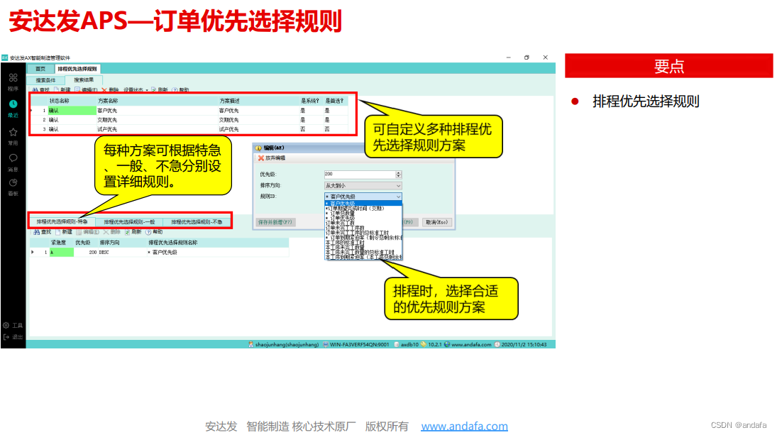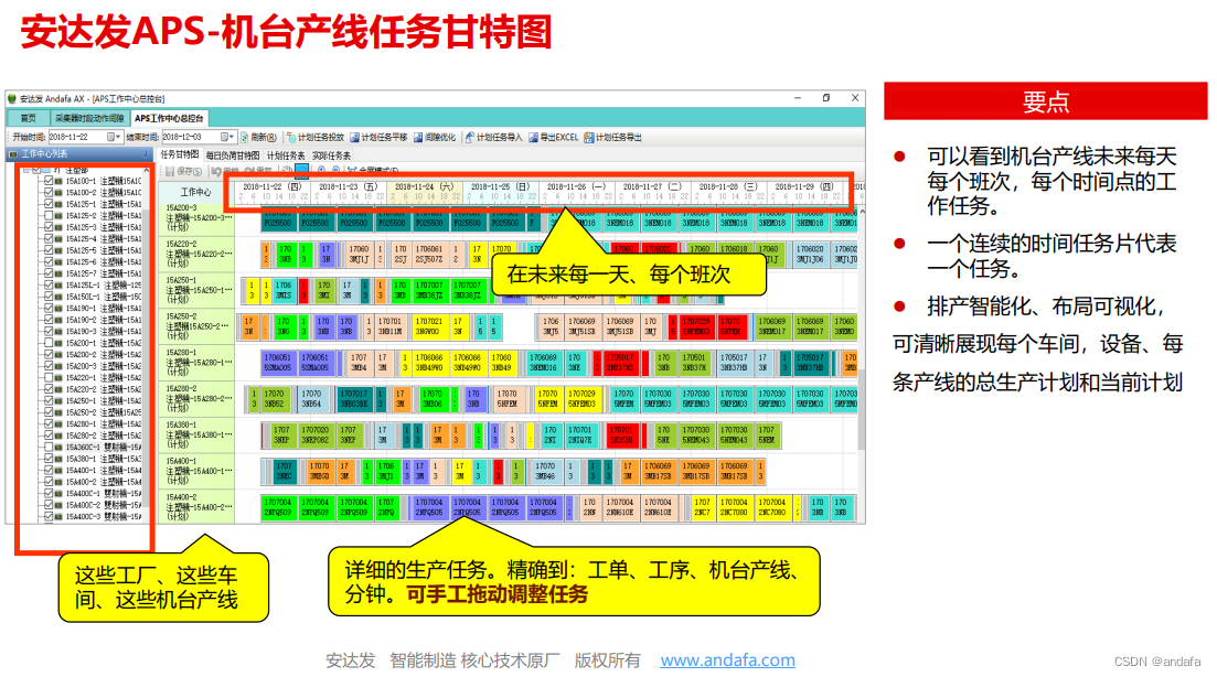 APS车间排产软件通过预先设定好相关基本资料与约束规则,自动考虑各种影响生产计划的因素,应用各类预设规则,最后给出最优化的计划方案,当订单、机台、工具、材料、上下班时间等任何影响生产计划的因素变化后,执行“一键式排程计算”,系统即可生成生产详细排程,也可选择不同的排产方案,可以实现不同的排程效果,也是设置无人值守的自动定时排程。
