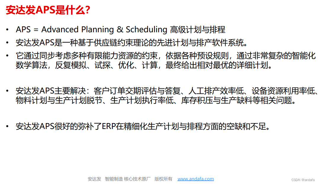 APS高级排程通过销售预测、物流运输计划、生产需求计划、智能优化排产、高级物料需求计划、供应商交货计划为企业提供供应链全流程计划与排产解决方案,实现交货需求、生产计划、采购计划、自制件、外购件的拉动式协同供应,从而显着减少交期延误、库存积压、与生产欠料等重大问题。