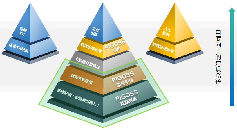 企业运维的智能化是一个不断迭代的过程。PIGOSS的BSM实现了企业智能运维建设之路中的第一步和第二步。PIGOSS ITSM、资产管理、PIGOSS智能巡检实现了运维场景的闭环和部分智能化。而更深入的企业运维智能化需要大数据分析和更多的AI算法加入其中,结合特定的运维场景才能得以实现。