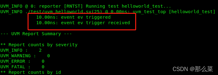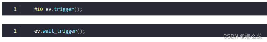 endinitial begin// get a reference to the global singleton object by // calling a static methoduvm_event_pool ev_pool = uvm_event_pool::get_global_pool();// 还记得此处的调用方式吗?补功课哦 如果不清楚// either create a uvm_event or return a reference to it// (which depends on the order of execution of the two// initial blocks - the first call creates the event,// the second and subsequent calls return a reference to// an existing event.)uvm_event ev = ev_pool.get("ev");// wait (an arbitrary) 10 and then trigger the event#10 ev.trigger();$display("%t: event ev triggered", $time);
