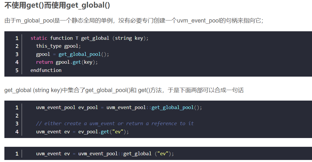 其实这两种做法的结果都是一样的,都是在uvm_event_pool::m_global_pool这个静态全局单例中的创建了一个uvm_event对象,并存放在关联数组uvm_event_pool::m_global_pool.pool[string]中,索引就是get or get_global ()的参数, 如果这个字符串索引已经存在,那么就返回这个pool[string]句柄。