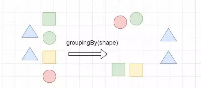 如图,我们使用groupingBy将根据进行分组为圆形一组,三角形一组,正方形一组。