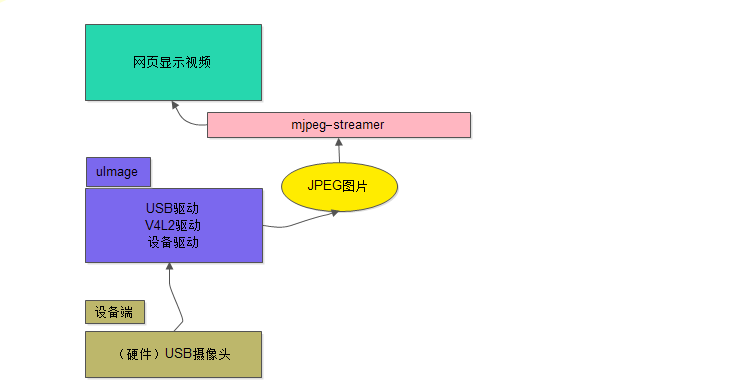 UVC摄像头+驱动+JPEG图库+mjpeg-streamer+HTML 完成了对用户远程提供视屏展示的服务。首先底层通过摄像头采集图片,通过驱动将数据流存储到JPEG图库,最终通过html交给用户的浏览器来解析,而mjpeg-streamer用来实现对这一流程的的控制。构成mjpeg-streamer视频流服务器。