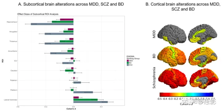 来自ENIGMA重度抑郁症(MDD)、精神分裂症(SCZ)和双相情感障碍(BD)工作组的结果表明,在这些诊断组中,皮质下体积a和皮质厚度b的改变有很大的重叠。在SCZ中观察到最广泛的影响和最高的效应大小(高达Cohen's d 0.5),其次是BD(Cohen's d 0.3),而在MDD中则有更多的局部影响和较低的效应大小(Cohen's d 0.15)。重要的是,所显示的结果是基于每种疾病内单独的病例对照比较,而不是来自患者群体之间的直接比较。各个疾病的数据是用相同的统一方法进行分析的。