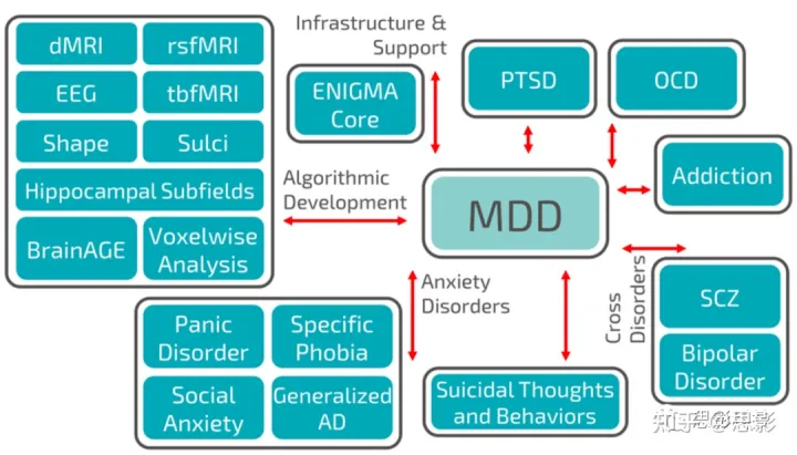 ENIGMA MDD联盟的未来计划还包括(但不限于): (1)分析MDD的异质性,(2)超越大脑结构测量,包括大脑功能改变,(3)阐明所识别的神经成像标记是MDD所特有的,还是在精神障碍中共享的,这些将在下面进一步讨论。