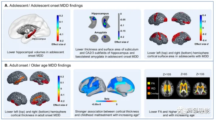 a青春期MDD患者的海马和杏仁核体积和形状发生改变,患有MDD的青少年皮质表面积降低。b皮质厚度改变和白质异常与成年期重度抑郁症患者和老年重度抑郁症患者和/或童年虐待患者特别相关。*这种关联与MDD诊断无关。MDD:重性抑郁障碍,FA:分数各向异性,RD:径向扩散系数。