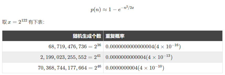 参考维基百科 ,利用生日导论,可以计算两个随机生成的 UUID 重复的概率(真正有效的是 122 位,其它位被用来标识 UUID 的版本)是: