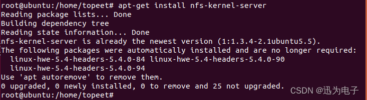 这里选择虚拟机 Ubuntu 作为主机。首先在虚拟机Ubuntu 上安装NFS 服务,这是一个软件包,可以使用 apt 命令下载(要保证虚拟机可以上网)。 在虚拟机Ubuntu 的root 用户下输入以下命令安装 Ubuntu NFS 服务: