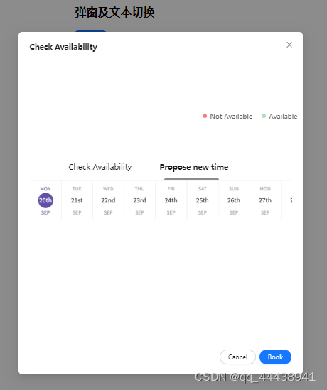 {fontFamily: "Noto Sans JP",fontSize: "26px",fontWeight: "700",color: "rgba(28,26,27,1)",lineHeight: "39px"}}wrapClassName="modal-wrap"okText="Book"cancelButtonProps={{ shape: 'round' }}okButtonProps={{ shape: 'round' }}width={600}visible={visiable}title="Check Availability" onCancel={close} onOk={submit}>{zIndex: '1'}}// backgroundColor="red"alignItems="unset"justifyContent="unset"overflow="hidden"position="relative"padding="0px 0px 0px 0px">{cursor:"pointer"}}onClick={(event) => {handleCheck()}}{...getOverrideProps(overrides, "Check Availability")}>{cursor:"pointer"}}onClick={(event) => {handlePropose()}}{...getOverrideProps(overrides, "Propose new time")}>{ minX: 0, minY: 0, width: 10, height: 10 }}paths={[{d: "M10 5C10 7.76142 7.76142 10 5 10C2.23858 10 0 7.76142 0 5C0 2.23858 2.23858 0 5 0C7.76142 0 10 2.23858 10 5Z",fill: "rgba(245,128,128,1)",fillRule: "nonzero",},]}display="block"gap="unset"alignItems="unset"justifyContent="unset"shrink="0"position="relative"{...getOverrideProps(overrides, "Ellipse 11232777")}>{ minX: 0, minY: 0, width: 10, height: 10 }}paths={[{d: "M10 5C10 7.76142 7.76142 10 5 10C2.23858 10 0 7.76142 0 5C0 2.23858 2.23858 0 5 0C7.76142 0 10 2.23858 10 5Z",fill: "rgba(176,222,187,1)",fillRule: "nonzero",},]}display="block"gap="unset"alignItems="unset"justifyContent="unset"shrink="0"position="relative"{...getOverrideProps(overrides, "Ellipse 11232781")}>)