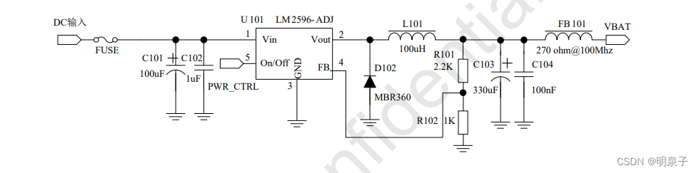 C101、C103为储能电容、C102、C104为旁路电容,FB101为磁珠。L101为电感主要用于滤去电流纹波。
