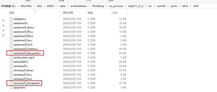 2)找到要修改的文件目录“lwip211_v1_2\src\contrib\ports\xilinx\netif”中文件“xaxiemacif_physpeed.c”和“xemacpsif_physpeed.c”要修改。