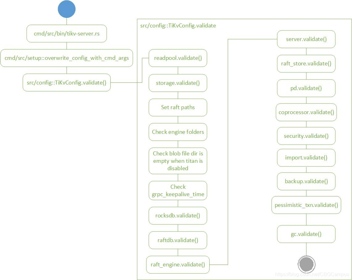 从配置流程主干流程上可以看到,系统从cmd/bin/tikv-server开始运行,进入cmd/src/setup获取配置文件参数,之后进入src/config.rs执行各个模块的配置逻辑。