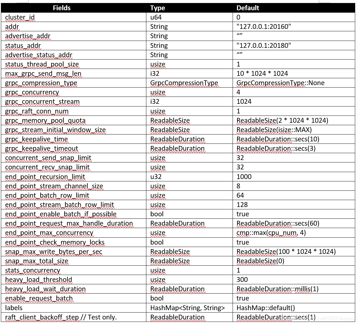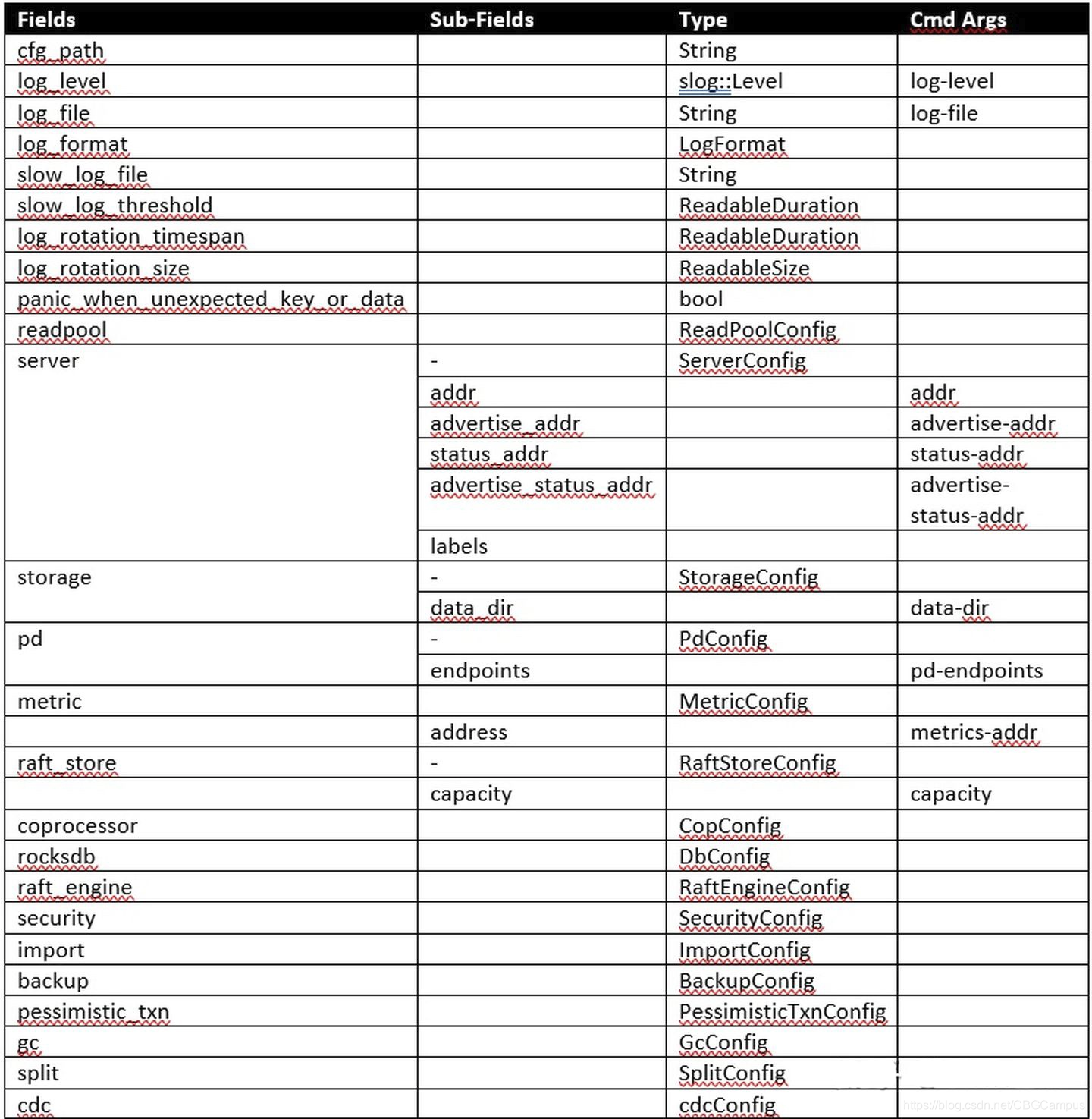 我们首先选择了Config这部分代码逻辑来分析,一个是相对其他功能模块来说,这部分代码没有太烧脑的算法逻辑,另一个原因是这部分代码是整个TiKV启动后马上运行的部分,是最先碰到的代码逻辑,再有就是可以通过配置代码大体了解TiKV内部那些重要的功能模块们,从而避免繁杂的细节导致窥测一斑的局限。如果想整体了解配置字段,我们可以从官网上查阅完整的配置说明文档。