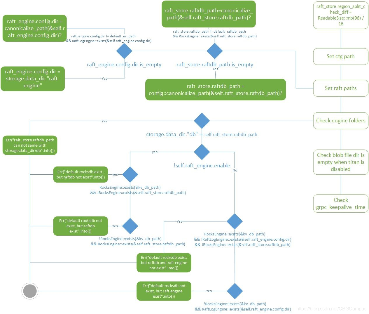- 配置rocksdb目录,默认配置为storage.dat_dir"/db",也就是"./db"。但是这个路径不能和raftdb放在一起,所以会有一个检查,检查有问题会抛出"raft_store.raftdb_path can not same with storage.data_dir/db"的错误。之后会根据kv_db_path, raft_store.raftdb_path, raft_engine.config.dir对目录内的数据库文件进行检查,判断是否存在对应的数据库。