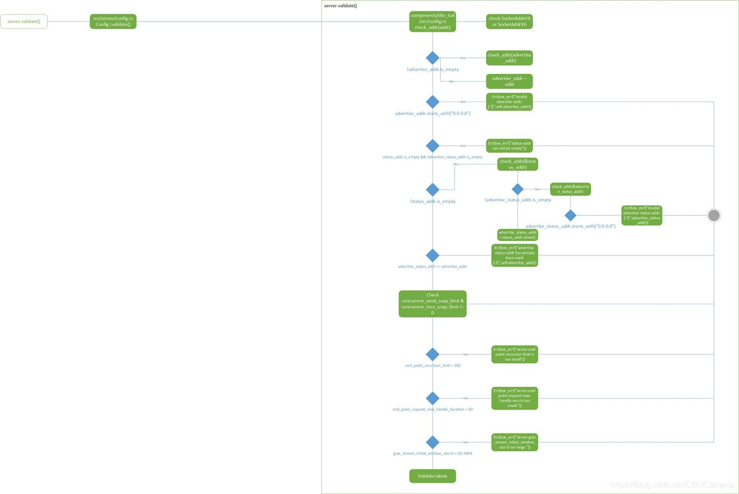 从流程图上也可以看出,服务器配置相对来说是所有配置里面算逻辑复杂的,但大体上分成几个部分:对ip地址/端口的检查,snapshot收发量检查,被调用的递归深度和时长的检查,grpc的配置检查。