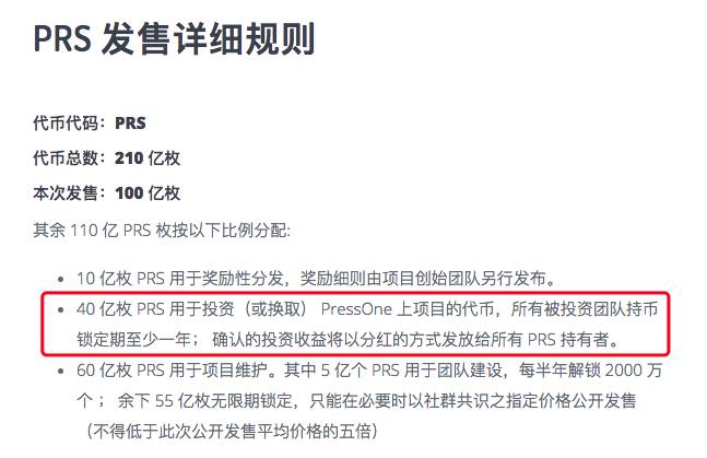 在分红权利上,PressOne 只介绍了 40 亿枚代币投资的项目有收益分红(下图)。而 PressOne 本身公司的经营收益如何分配,并未提及。