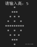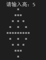 *# 实心菱形 i = 1 h = int(input('请输入高:')) for i in range(1,h+1):space_sum = h - istar_sum = 2*i - 1print(' '*space_sum + '*'*star_sum)for i in range(h-1,0,-1):space_sum = h - istar_sum = 2*i - 1print(' '*space_sum + '*'*star_sum)