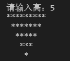 *# 倒等腰三角形 i = 1 h = int(input('请输入高:')) for i in range(h,0,-1):space_sum = h - istar_sum = 2*i - 1print(' '*space_sum + '*'*star_sum)