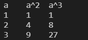 3 9 27print(f"{'a':3} {'a^2':3} {'a^3':3}") for a in range(1,4):print(f'{a}'.ljust(3),f'{a**2}'.ljust(3),f'{a**3}'.ljust(3),sep = ' ')