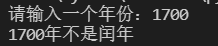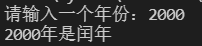 y = int(input('请输入一个年份:')) if y % 4 == 0 and y % 100 != 0 or y % 400 == 0:print(f'{y}年是闰年') else:print(f'{y}年不是闰年')