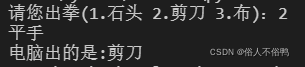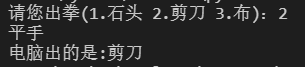 import random player = int(input('请您出拳(1.石头 2.剪刀 3.布):')) com = random.randint(1,3) if player == 1 or player == 2 or player == 3:if com == 1:com = '石头'if player == 1:print('平手')elif player == 2:print('您输了')else:print('您赢了')elif com == 2:com = '剪刀'if player == 1:print('您赢了')elif player == 2:print('平手')else:print('您输了')else:com == '布'if player == 1:print('您输了')elif player == 2:print('您赢了')else:print('平手')print(f'电脑出的是:{com}') else:print('不符合出拳规则!')