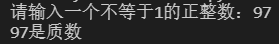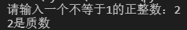 num = int(input('请输入一个不等于1的正整数:')) if num == 2:print(f'{num}是质数') elif num % 2 == 0:print(f'{num}不是质数') else:x = num//2 + 2for i in range(2,x):if num % i == 0:print(f'{num}不是质数')breakelse:print(f'{num}是质数')