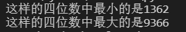for m in range(1,10):for n in range(0,10):x = m*1000 + 300 + 60 + nif x%2 == 0 and x%3 == 0:print(f'这样的四位数中最小的是{x}')breakbreakfor m in range(9,0,-1):for n in range(9,-1,-1):x = m*1000 + 300 + 60 + nif x%2 == 0 and x%3 == 0:print(f'这样的四位数中最大的是{x}')breakbreak