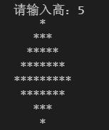 *********# 等腰三角形 i = 1 h = int(input('请输入高:')) for i in range(1,h+1):space_sum = h - istar_sum = 2*i - 1print(' '*space_sum + '*'*star_sum)