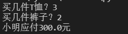小明在该店买了3件T恤和2条裤子,请计算并显示小明应该付多少钱shirt_price = 35 pant_price = 120 shirt = int(input('买几件T恤?')) pant = int(input('买几件裤子?')) if shirt == 2:shirt_price = shirt_price * 0.9 if shirt >= 3:shirt_price = shirt_price * 0.8 if pant >= 2:pant_price = pant_price * 0.9 print(f'小明应付{shirt * shirt_price + pant * pant_price}元')