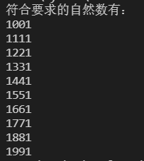 print('符合要求的自然数有:') for A in range(1,10):for B in range(0,10):for C in range(0,10):for D in range(0,10):x = A*1000 + B*100 + C*10 + Dy = D*1000 + C*100 + B*10 + Aif x*A == y:print(x)