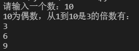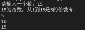 num = int(input('请输入一个数:')) if num % 2 == 0:print(f'{num}为偶数,从1到{num}是3的倍数有:')for x in range(1,num+1):if x % 3 == 0:print(x) else:print(f'{num}为奇数,从1到{num}是5的倍数有:')for x in range(1,num+1):if x % 5 == 0:print(x)