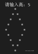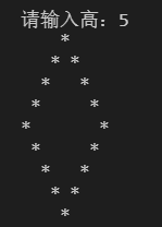 *# 空心菱形 i = 1 h = int(input('请输入高:')) for i in range(1,h+1):space1_sum = h - ispace2_sum = 2*i - 3if i == 1:print(' '*space_sum + '*')else:print(' '*space1_sum + '*' + ' '*space2_sum + '*')for i in range(h-1,0,-1):space1_sum = h - ispace2_sum = 2*i - 3if i == 1:print(' '*space_sum + '*')else:print(' '*space1_sum + '*' + ' '*space2_sum + '*')