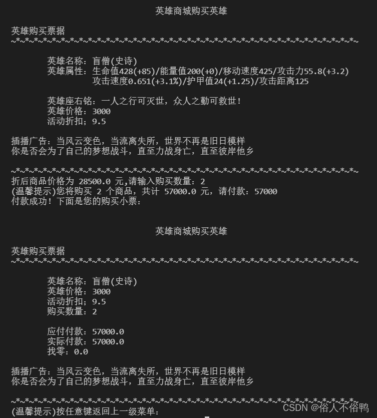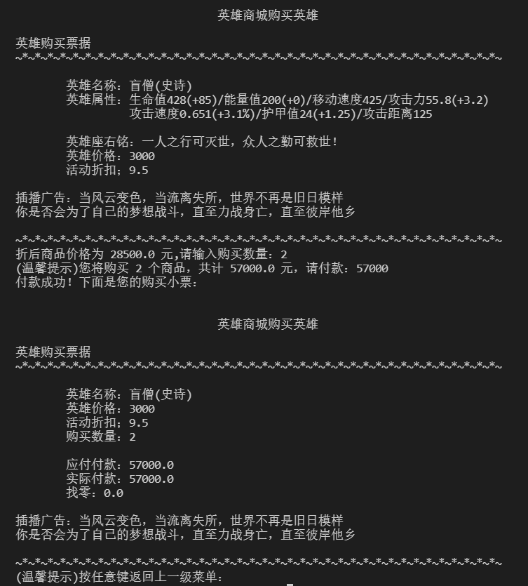输入付款金额->打印购买小票(扩展)# 英雄详情购买页面 print('\n\n\t\t\t\t英雄商城购买英雄\n') print('英雄购买票据') print('~*'*38+'~') print() print('\t英雄名称:盲僧(史诗)') print('\t英雄属性:生命值428(+85)/能量值200(+0)/移动速度425/攻击力55.8(+3.2)\n\t\t 攻击速度0.651(+3.1%)/护甲值24(+1.25)/攻击距离125') print() print('\t英雄座右铭:一人之行可灭世,众人之勤可救世!') print('\t英雄价格:3000') print('\t活动折扣;9.5') print() print('插播广告:当风云变色,当流离失所,世界不再是旧日模样\n'+'你是否会为了自己的梦想战斗,直至力战身亡,直至彼岸他乡\n') print('~*'*38+'~')n = int(input(f'折后商品价格为 {3000*9.5} 元,请输入购买数量:')) money = float(input(f'(温馨提示)您将购买 {n} 个商品,共计 {3000*9.5*n} 元,请付款:')) while True:if money < 3000*9.5*n:print('余额不足,请重新付款!')money = float(input(f'(温馨提示)您将购买 {n} 个商品,共计 {3000*9.5*n} 元,请付款:'))else:print('付款成功!下面是您的购买小票:')break# 订单页面:打印小票 print('\n\n\t\t\t\t英雄商城购买英雄\n') print('英雄购买票据') print('~*'*38+'~') print() print('\t英雄名称:盲僧(史诗)') print('\t英雄价格:3000') print('\t活动折扣;9.5') print(f'\t购买数量:{n}') print() print(f'\t应付付款:{3000*9.5*n}') print(f'\t实际付款:{money}') print(f'\t找零:{money - 3000*9.5*n}') print() print('插播广告:当风云变色,当流离失所,世界不再是旧日模样\n'+'你是否会为了自己的梦想战斗,直至力战身亡,直至彼岸他乡\n') print('~*'*38+'~') input('(温馨提示)按任意键返回上一级菜单:')