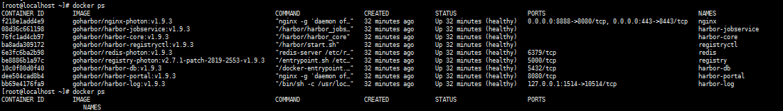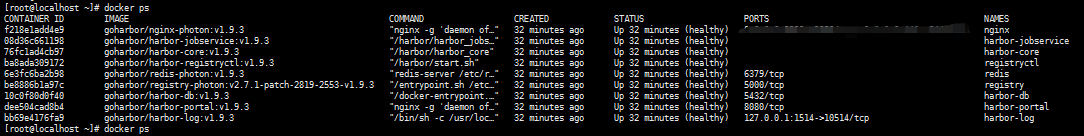 50ac7fb54815 goharbor/harbor-jobservice:v1.9.3 "/harbor/harbor_jobs…" 32 minutes ago Up 32 minutes (healthy) harbor-jobservice