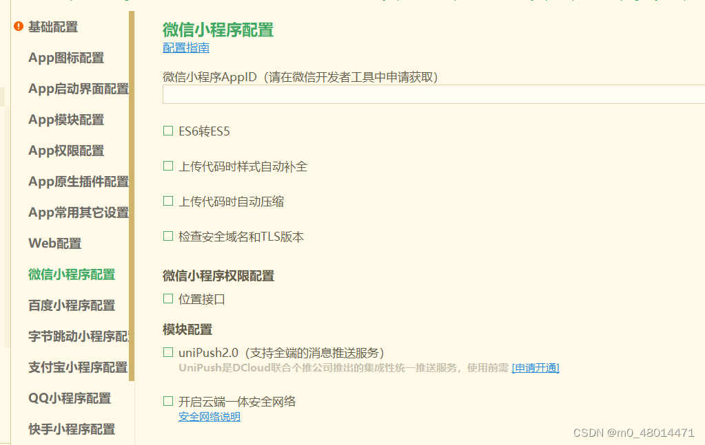 manifest.json 文件是应用的配置文件,用于指定应用的名称、图标、权限等 如下图就是配置微信小程序 用于微信开发者工具的界面