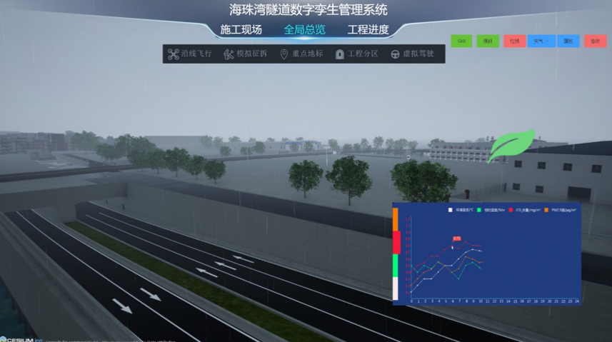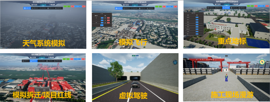 实时联动天气系统、通过模拟飞行功能总览项目全景、重点地标快速跳转、模拟拆迁项目红线、虚拟驾驶沉浸式体验项目建成后的效果、施工现场漫游,实现足不出户了解工地情况。