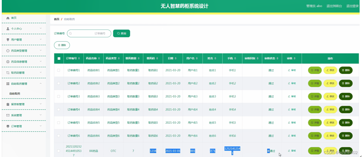 自助取药管理:通过列表可以查看订单编号、药品名称、药品类型、取药数量、取药码、日期、用户名、姓名、手机、审核回复、审核状态、审核等信息,并根据需要进行详情,修改或删除等操作,如图5-12所示。