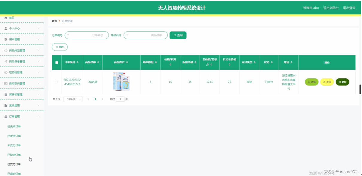 订单管理:通过已支付订单列表可以查看订单编号、商品名称、商品图片、购买数量、价格/积分、折扣价格、总价格/总积分、折扣总价格、支付类型、状态、地址等信息进行详情、发货或删除等操作,还可以根据需要对已完成订单、已发货订单、未支付订单、已取消订单、已退款订单进行相应操作;如图5-14所示。