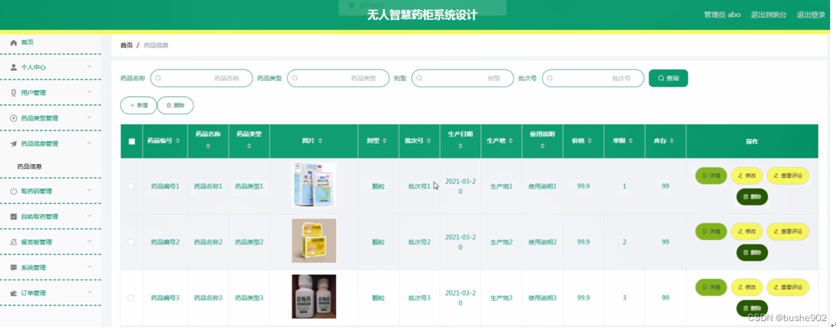 系统设计主要是管理员登录后对整个系统相关操作进行处理,可进行管理员的添加和删除,用户管理、药品类型管理、药品信息管理、取药码管理、自助取药管理、留言板管理、系统管理、订单管理等操作管理。