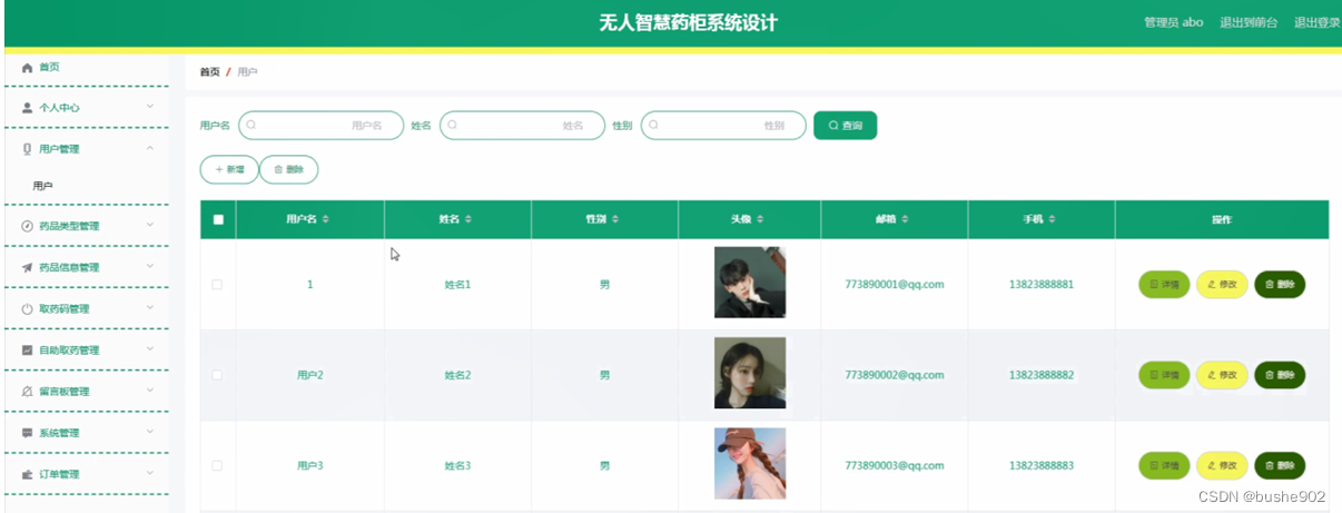 用户管理:通过列表可以查看用户名、姓名、性别、头像、邮箱、手机等信息,并根据需要进行详情,修改或删除等操作,如图5-8所示。