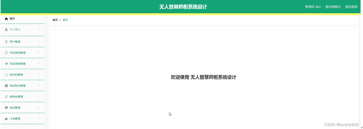 管理员登录成功后进入到系统操作界面,可以对首页、个人中心、用户管理、药品类型管理、药品信息管理、取药码管理、自助取药管理、留言板管理、系统管理、订单管理等功能进行相对应操作,如图5-7所示。