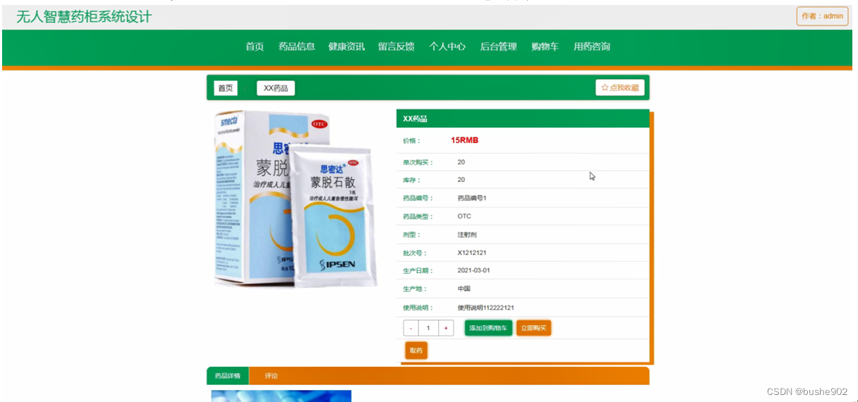 药品信息,在药品信息页面可以查看药品名称、价格、图片、单次购买、库存、药品编号、药品类型、剂型、批次号、生产日期、生产地、使用说明、药品详情等详细内容进行添加到购物车、立即购买、取药、评论或收藏,如图5-4所示。