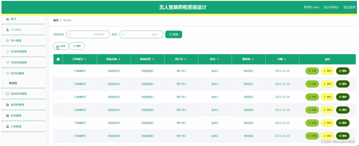 取药码管理:通过列表可以查看订单编号、药品名称、药品类型、用户名、姓名、取药码、日期等信息,并根据需要进行详情,修改或删除等操作,如图5-11所示。