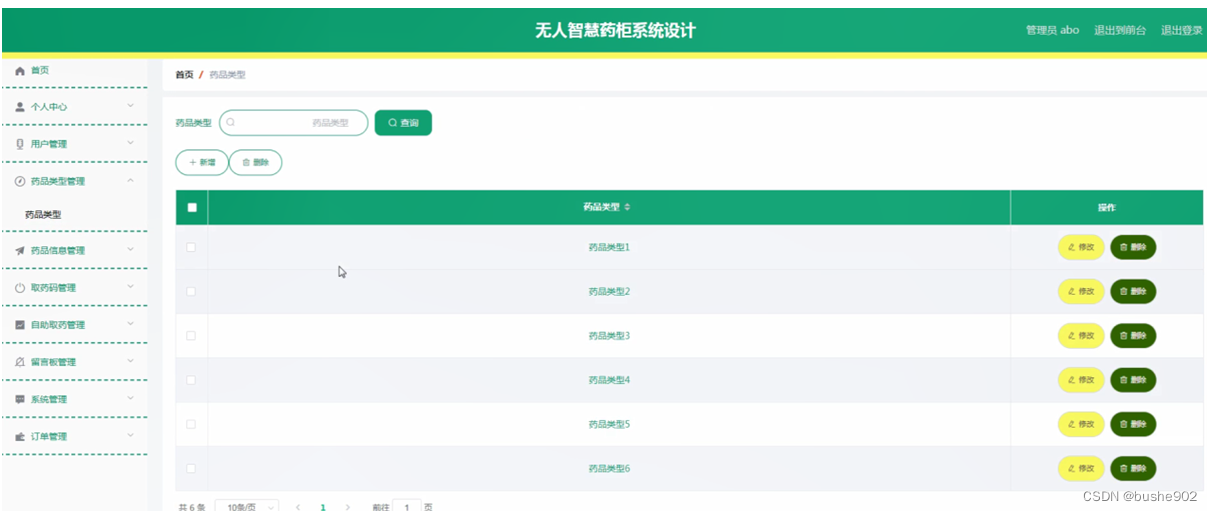 药品类型管理:通过列表可以查看药品类型信息,并根据需要进行修改或删除等操作,如图5-9所示。