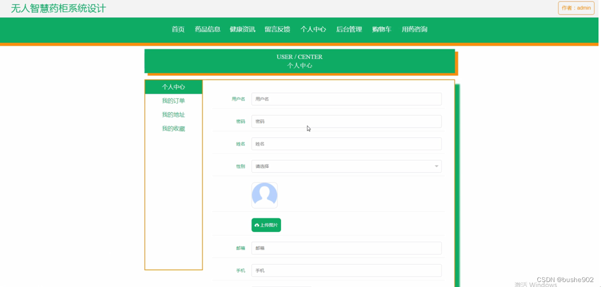 用户注册,在用户注册页面通过填写用户名、密码、姓名、邮箱、手机等信息完成用户注册,如图5-5所示。在个人中心页面通过填写用户名、密码、姓名、性别、图片、邮箱、手机、余额等信息进行个人信息修改操作,还可以根据需要对我的订单、我的地址、我的收藏进行详细操作;如图5-6所示。