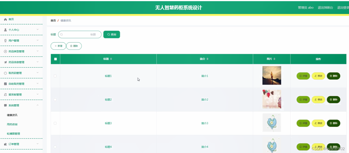 系统管理:通过健康资讯列表可以查看标题、简介、图片等信息,并根据需要进行详情,修改或删除等操作,还可以根据需要对用药咨询、轮播图管理进行相应操作;如图5-13所示。