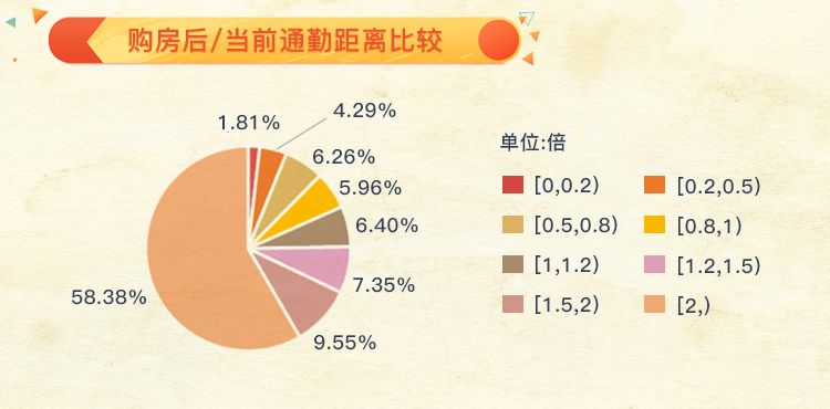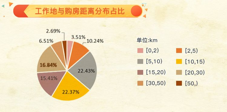 购买楼盘距离当前工作地在2公里以内的购房人群仅占3.5%,5公里至30公里是购房者普遍选择的买房半径。买房后,58%的购房人群上班路程将会翻倍,为了住新房,再挤的地铁,再慢的公交,再多的红绿灯也忍了。