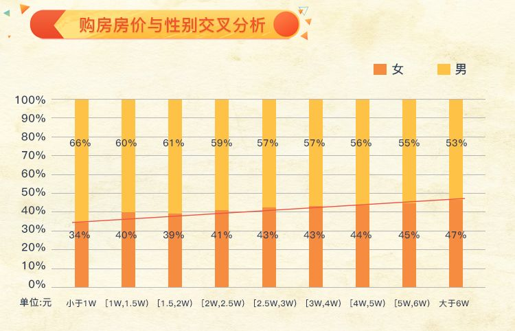 男性是家庭收入的劳动工具或许是个伪命题,但女性是提升家庭居住质量的第一生产力绝对不掺假。随着楼盘单价的上升,女性购房人群占比呈现出上升趋势,女性对住宅品质的追求明显大于男性,最直观的就体现在对房价的态度上。