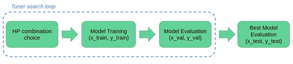 首先,定义一个调谐器。它的作用是确定应测试哪些超参数组合。库搜索功能执行迭代循环,该循环评估一定数量的超参数组合。通过在保持的验证集中计算训练模型的准确性来执行评估。